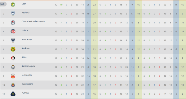 Los otros equipos que se encuentran más atrás delos Panzas Verdes y los Tuzos, en zona de calificación de Liguilla, son Altético San Luis (24 puntos), Toluca (23 puntos), Monterrey (21 puntos),América (21 puntos), Atlas (18puntos)y Santos (18 puntos).