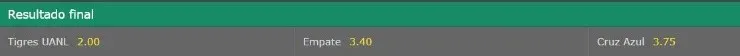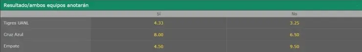 Con estos antecedentes, las apuestas indican que el favorito para quedarse con este juego es para Tigres. Para bet365, los felinos pagan 2.00 veces lo apostado. Mientras que si te la juegas por el empate, este resultado paga 3.40. Finalmente, si eres de quienes apostará a Cruz Azul, el resultado paga 3.75.