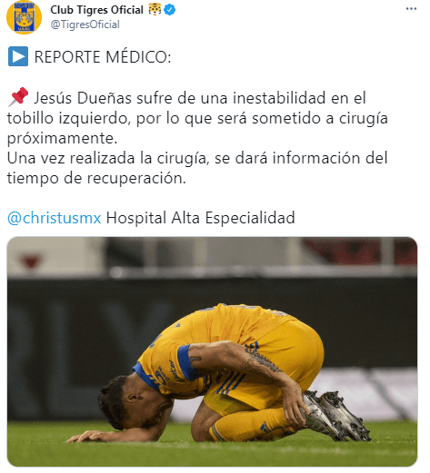 La semana empezó con dificultades para el Tuca en el entrenamiento del conjunto Felino de este lunes. Por un lado, la institución dio a conocer un parte médico en el que anuncia que Jesús Dueñas será operado debido a una lesión en el tobillo izquierdo. Una inestabilidad en dicha zona demanda que el lateral pase por el quirófano. ¿El tiempo de recuperación?, dependerá del resultado y la respuesta física.