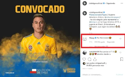 En Instagram,Los Felinosanunciaron y felicitaron a Eduardo Vargas por su convocatoria a la Selección chilena en las últimas horas de ayer.