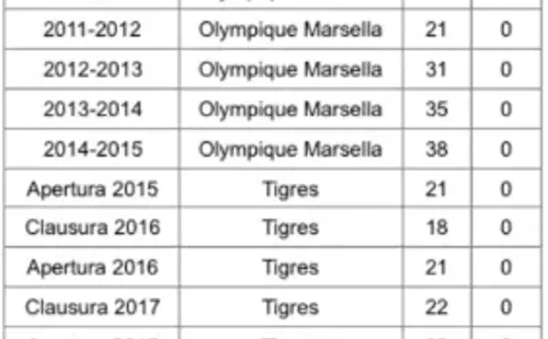 El club, a través de sus redes sociales,presentó datos estadísticos de la trayectoria de Gignac, la cual inició en la Liga 1 de su país en la Temporada 2006-2007 con el Lorient, después siguió Toulouse, Olympique de Marsella y Tigres.