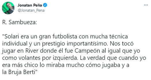 “Aquí en México sí me tocó enfrentarlo (a Solari) cuando yo jugaba en Estudiantes Tecos y él en Atlante. Era un gran futbolista con mucha técnica individual y con un prestigio importantísimo. Nos tocó jugar en River Plate donde él fue Campeón al igual que yo como volantes por izquierda. La verdad que cuando yo era más chico lo miraba mucho cómo jugaba y también a la “Bruja” Berti porque lo hacían en mi posición de volante por izquierda y quería aprender de ellos”, señaló.