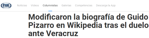 En México encontraron una curiosa forma de vengarse. Al igual que lo que había ocurrido con Antonio Briseño después de la patada a Giovani Dos Santos, a Guido Pizarro le modificaron el perfil en ‘Wikipedia’ por unos momentos.