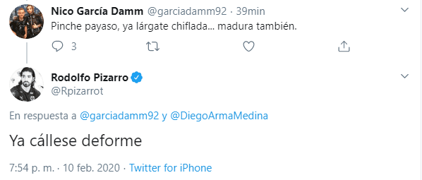 “Ya cállese deforme”, escribió Pizarro al aficionado de La Pandilla que le había pedido que se fuera urgente de Monterrey y que madurara.