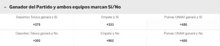 Para este juego, pone mucha atención. Betway nos cuenta que el favorito para ganar es el Toluca, que paga +130, en desmedro de los +200 que pagan los Pumas. Si crees que terminará en empate, el resultado paga +230. Ahora, si crees que Toluca ganará, pero ambos equipos marcarán, este momio en Betway paga +375. Pero si eres de quienes piensa que Pumas ganará, y solo ellos marcarán, paga +400.