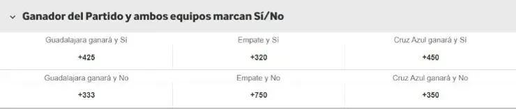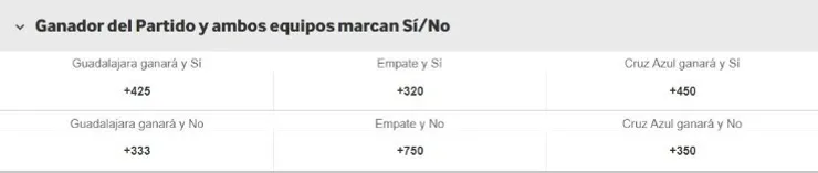 Si eres de quienes cree que las Chivas ganarán, y además ambos cuadros marcarán, en Betway el momio paga +425. Pero si eres de los que piensa que habrá empate, con ambos equipos marcando en el encuentro, paga +320, en desmedro de los +350 que paga si Cruz Azul gana, y solo ellos anotando los goles.