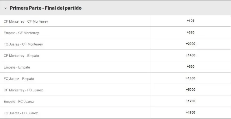 Si piensas que Monterrey se impondrá en el partido, el resultado es el favorito de Betway, que paga +105 en sus momios. Ahora, si piensas que el primer tiempo termina en empate, pero finaliza con el triunfo del cuadro de Mohamed, paga +320.