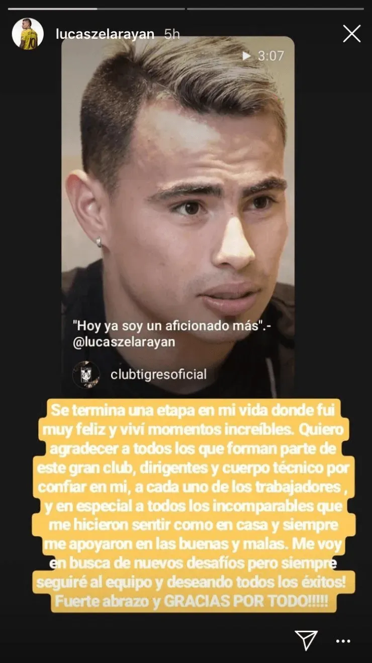 Lucas Manuel Zelarayán abandonó Tigres luego de cinco años para marcharse a la Major League Soccer, pero antes le dejó un mensaje a la multitudinaria afición mediante una historia en su cuenta oficial de Instagram.