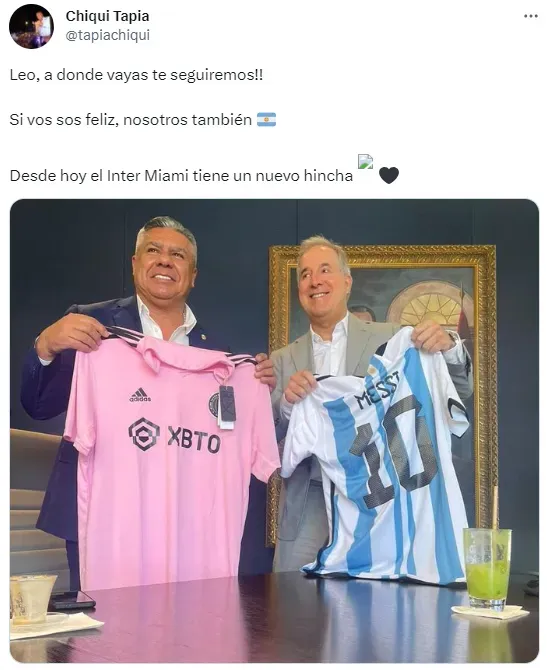Las repercusiones por el desembarco de Messi en el club propiedad de David Beckham no tardaron en llegar. Minutos después de la confirmación del jugador, Chiqui Tapia apareció con una publicación en su cuenta personal de Twitter para desearle lo mejor.