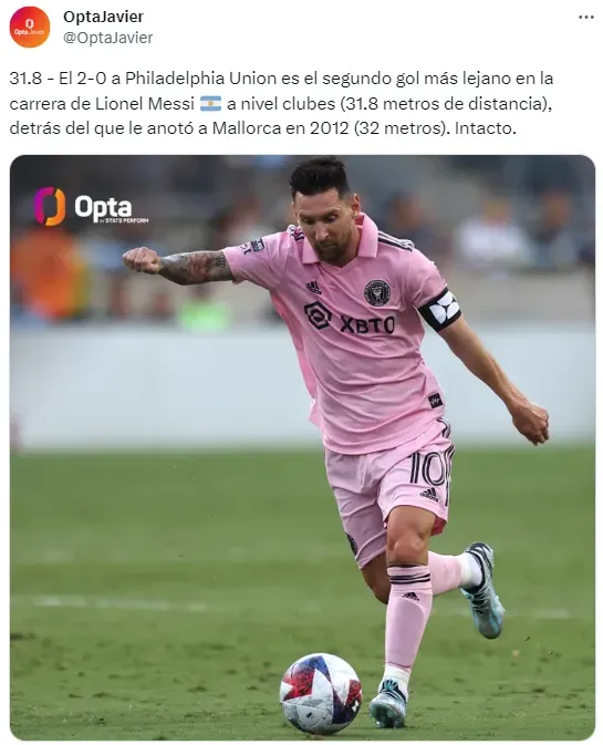 Según el dato aportado por Opta, la plataforma especializada en estadísticas, Messi marcó desde 31,8 metros de distancia. Esto significa que es el segundo gol más lejano de su carrera a nivel clubes, detrás del gol de 32 metros que le anotó a Mallorca en 2012 por LaLiga para Barcelona. En aquella jugada, fue un centro que nadie pudo conectar y se metió en el fondo de la red.