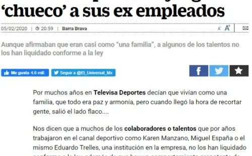 “Les ofrecieron como liquidación sólo su sueldo de quince días, cuando a algunos les restaban tres meses o más de contrato”, expuso dicho medio acerca del incumplimiento de las leyes por parte de la televisora.