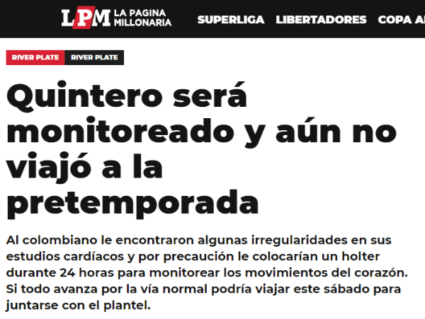 River ayer comenzó la pretemporada, pero hubo una muy mala noticia. ¿Qué pasó? Juan Fernando Quintero todavía no se encuentra con el plantel. ¿Por qué? Porque sus estudios médicos no dieron bien.