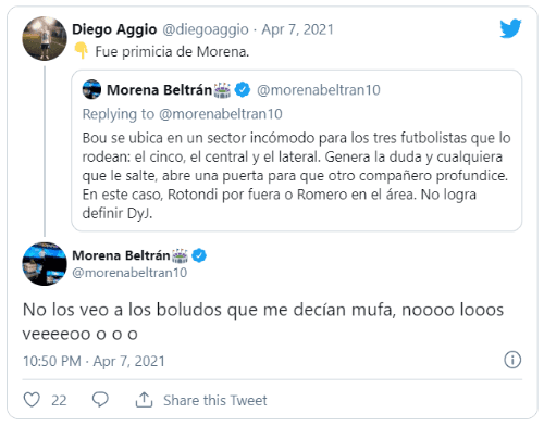 Hoy, consolidada en televisión, no pierde la costumbre y continúa con la rutina de escribir tuits sobre cada partido que pasa ante sus ojos. El pasado miércoles, More aprovechó para mirar la caída deDefensa y Justicia antePalmeiras por la Recopa Sudamericana.