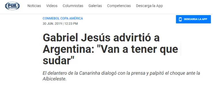 Analizando el cotejo por disputarse, quien dio sus sensaciones con respecto al mismo fue Gabriel Jesus, atacante del elenco comandado por Tite.