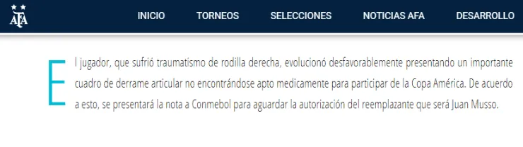 “El jugador evolucionó desfavorablemente presentando un importante cuadro de derrame articular no encontrándose apto medicamente para participar de la Copa América. De acuerdo a esto, se presentará la nota a Conmebol para aguardar la autorización del reemplazante que será Juan Musso”, comunicaron.