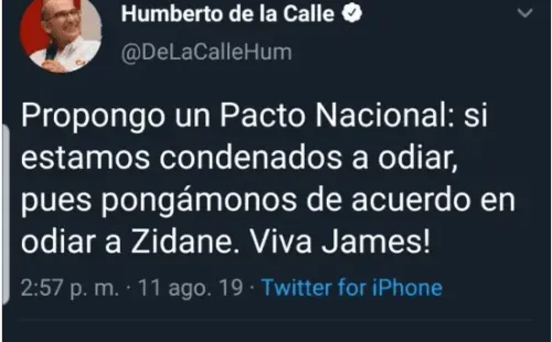 Gran polémica ha causado en Colombia y España un trino del exnegociador con las FARC y candidato presidencial, entre otros cargos, Humberto de la Calle, en el cual llamó a un pacto nacional para odiar a Zinedine Zidane por el maltrato que le ha dado a James Rodríguez en el Real Madrid.
