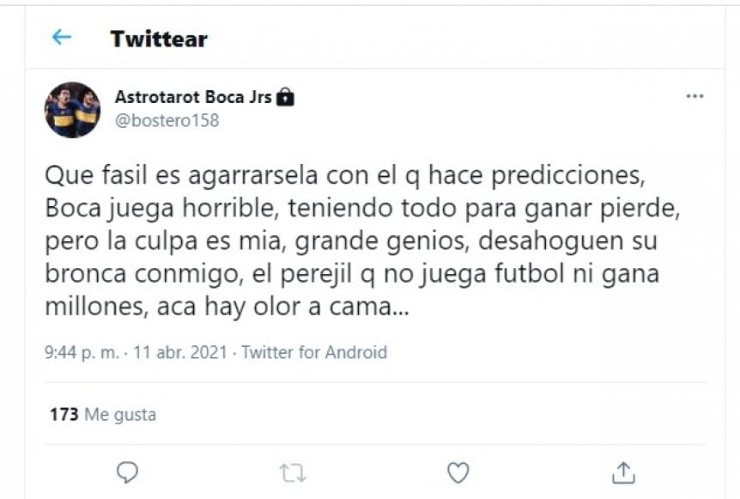 Exteriorizando su fastidio por el trato recibido, el tarotista, a través de su cuenta de Twitter, arremetió contra quienes lo criticaron y escribió: “Qué fácil agarrársela con el que hace predicciones.Boca juega horrible, teniendo todo para ganar pierde, pero la culpa es mía.Grande, genios”.