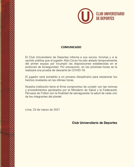 Mediante comunicado publicado en sus redes sociales oficiales, el club Universitario informó que Aldo Corzo fue aislado del plantel crema como prevención por no cumpli con los protocolos sanitarios que rigen en la Liga 1, además de ser sometido a un proceso disciplinario.