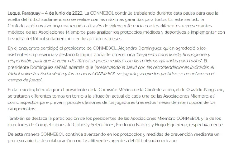 En la misma estuvoAlejandro Domínguez, presidente de la Conmebol, donde destacó: “Preservando la salud con las recomendaciones indicadas, el fútbol volverá a Sudamérica y los torneos CONMEBOL se jugarán, ya que los partidos se resuelven en el campo de juego“.