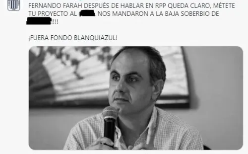 La cuenta oficial de Twitter del Comando Sur, barra de Alianza Lima, se manifestó por las tantas palabras de Fernando Farah que no gustaron a los hinchas de Alianza: “Fernando, después de hablar en RPP, queda claro. Métete tu proyecto al c… nos mandaron a la baja, soberbios de m… ¡Fuera Fondo Blanquiazul!”.