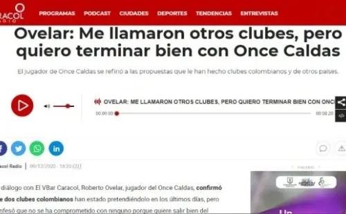 “Tengo ofertas de Perú, pero no quiero decirles aún que sí porque tengo contrato acá en Once Caldas. Me llamaron dos clubes de Colombia, pero quiero terminar bien con Once Caldas”, dijo en entrevista a ‘El VBar Caracol’.