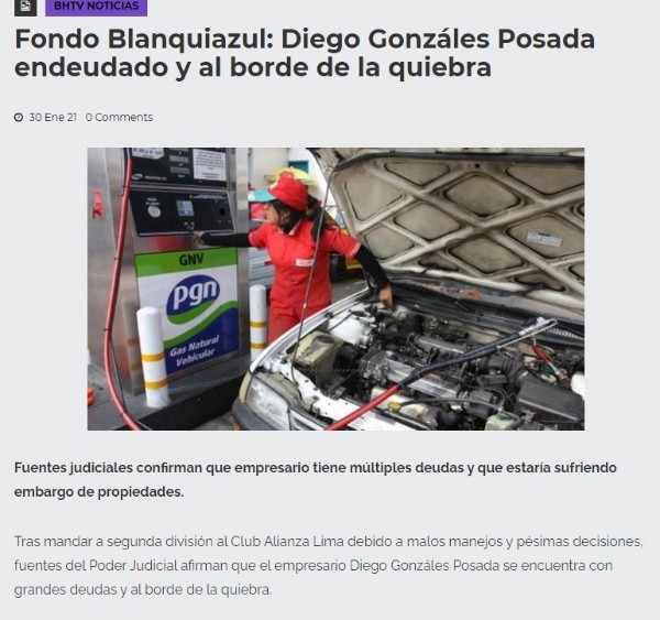 Según la nota realizada por la web ‘BHTV Nuestro Canal’ donde citan fuentes del Poder Judicial, el mayoraccionista del Fondo Blanquiazul (grupo de socios que compró la deuda de Alianza Lima)Diego Gonzáles Posada se encuentra con grandes deudas y al borde de la quiebra.