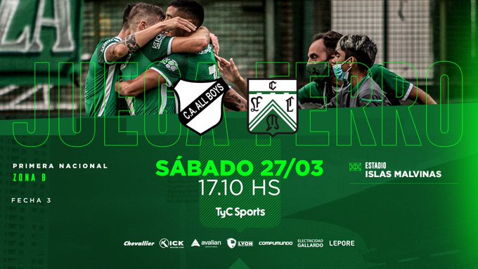 EN VIVO Y EN DIRECTO |Por la tercerafecha de laPrimera Nacional,All Boysrecibe al conjunto deFerro Carril Oesteen un encuentro que será vibrante para los fanáticos de ambos planteles y que se disputará este sábado27de marzo. El juego será transmitidoa través de la pantalla deTyC Sports y TyC Sports Play.