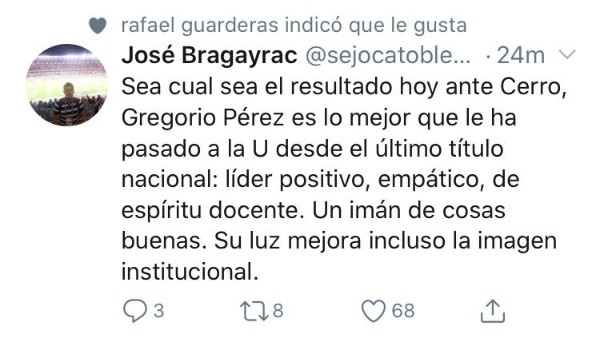 “Gregorio Pérez es lo mejor que le ha pasado a la U desde el título nacional”, comienza el texto. “Lider positivo, empático, de espíritu docente”, continua el Tweet que realmente elogia al DT.
