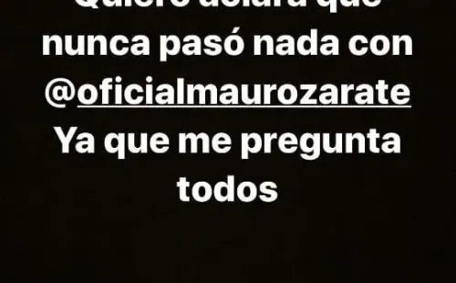 “Quiero aclarar que nunca pasó nada con Mauro Zárate, ya que me preguntan todos”, publicó este mensaje en sus stories.
