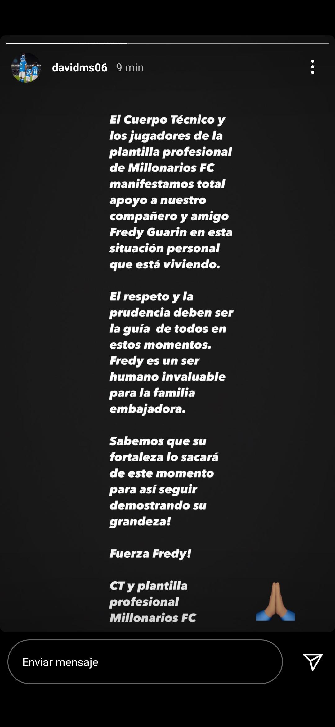 “El cuerpo técnico y los jugadores de la plantilla profesional de Millonarios FC, manifestamos total apoyo a nuestro compañero y amigo Fredy Guarín en esta situación personal que está viviendo. El respeto y la prudencia deben ser la guía de todos en estos momentos. Fredy es un ser humano invaluable para la familia embajadora. Sabemos que su fortaleza lo sacará de este momento para seguir demostrando su grandeza. ¡Fuerza Fredy!. CT y plantilla profesional Millonarios FC”.