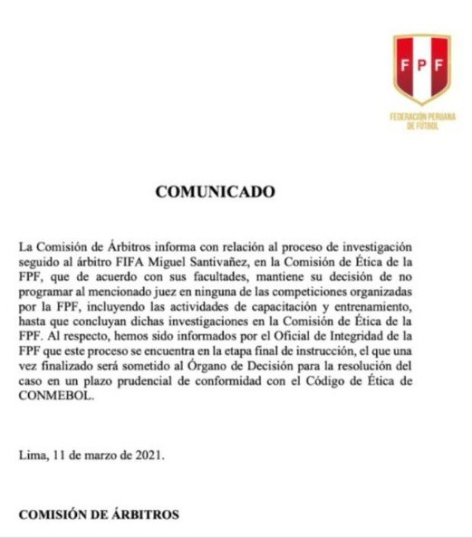 “Mantiene su decisión de no programar al mencionado juez en ninguna de las competiciones organizadas por la FPF, incluyendo las actividades de capacitación y entrenamiento, hasta que concluyan dichas investigaciones”, indicaron en un comunicado de La Conar.