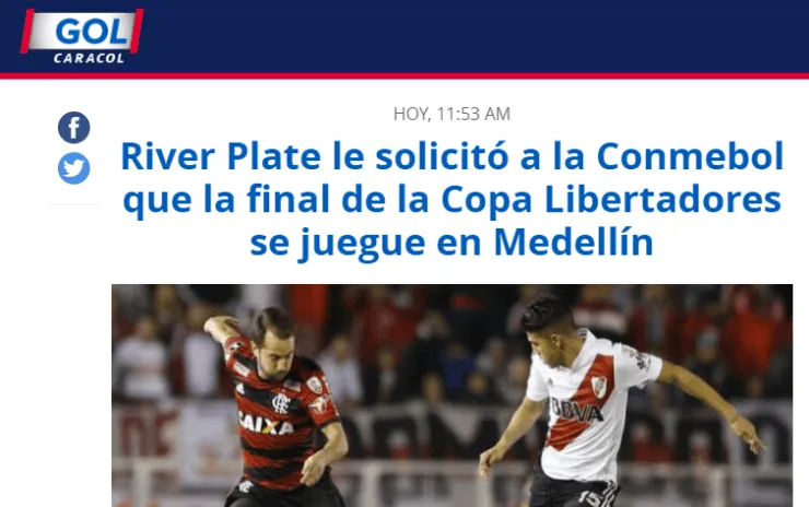 Según reveló Gol Caracol, el Millonario habría deslizado en la misma su deseo de cambiar de sede la final para evitar cualquier tipo de incidentes.