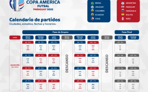 El primer partido del sábado será entre Perú y Venezuela, a las 11 de la mañana. Ambos equipos comparten el Grupo B con Argentina, Paraguay y Bolivia. Del otro lado, en el Grupo A, estarán Brasil, Uruguay, Colombia, Ecuador y Chile. En cada fecha dos equipos quedarán libres. El primer clasificado de cada zona enfrentará al segundo del otro grupo, mientras que el resto de los equipos competirán por el resto de los puestos. La final y el partido por el tercer puesto se harán el 6 de febrero.