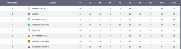 En este momento, América es el líder de esta clasificación con 44 puntos, lo siguen Junior con 43, Deportivo Cali con 41, Santa Fe y Tolima con 40. El que mejor quede en esta tabla y clasifique a la final será quien termine como local.