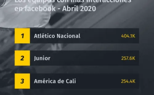 En Facebook, Atlético Nacionaltuvo más de 400milinteracciones, mientras que Junior llegó a las257 mil. El tercero en la lista fue el América de Cali con 254 mil.
