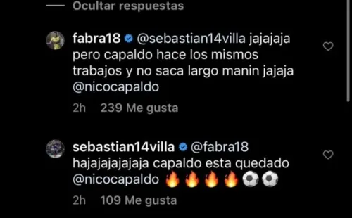 “Manito por eso es que tenes esos brazos así”, le escribió Villa en los comentarios a lo que su compatriota le respondió agarrándosela con otro colega: “Jajajaja pero Capaldo hace los mismos trabajos y no saca largo manin jajaja”.