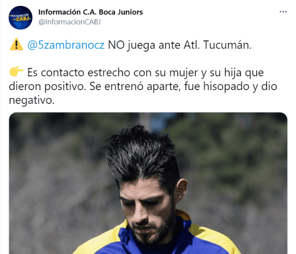 El DT tendría pensado poner un XI completamente alternativo el sábado, y Carlos Zambrano no iba a estar desde el arranque. Pero sí podía ser una variante desde el banco, algo que se descartó por la noticia de que su mujer e hija dieron positivo de coronavirus.