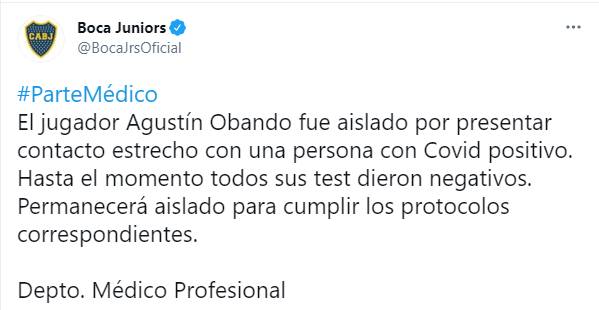 “El jugador Agustín Obando fue aislado por presentar contacto estrecho con una persona con Covid positivo. Hasta el momento todos sus test dieron negativos. Permanecerá aislado para cumplir los protocolos correspondientes“, lee el parte médico que emitió el club a tráves de las redes sociales.