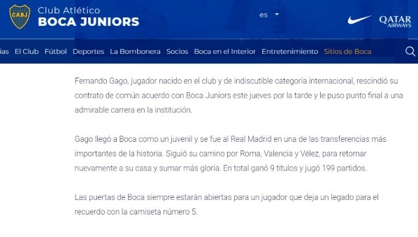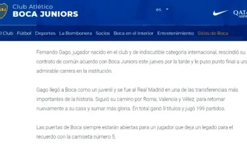 “Fernando Gago, jugador nacido en el club y de indiscutible categoría internacional, rescindió su contrato de común acuerdo con Boca Juniors este jueves por la tarde y le puso punto final a una admirable carrera en la institución”, reza el comunicado publicado en la página web.