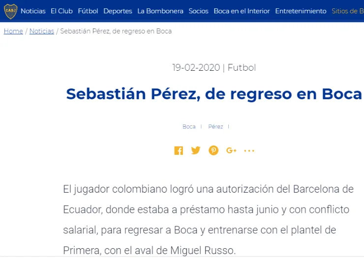 Manifestando que hasta mitad de año del 2020 se estará entrenando junto al plantel profesional del conjunto de La Ribera, Boca anunció que Pérez“logró una autorización del Barcelona de Ecuador para regresar a Boca y entrenarse con el plantel de Primera, con el aval de Miguel Russo”.