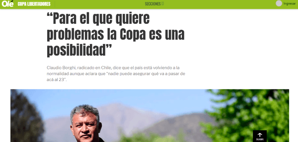 Sobre esto opinó Claudio Borghi, quien vive en el país trasandino, y advirtió: “Para cualquier persona que quiere problemasla Copa Libertadores es una posibilidad buena”.