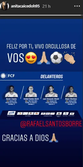 AnitaCaicedo también utilizó sus redes sociales para festejar por el logro de Rafael. La media naranja del artillero, expresando todos sus sentimientos, subió una historia y lanzó: “Feliz por ti, vivo orgullosa de vos”.