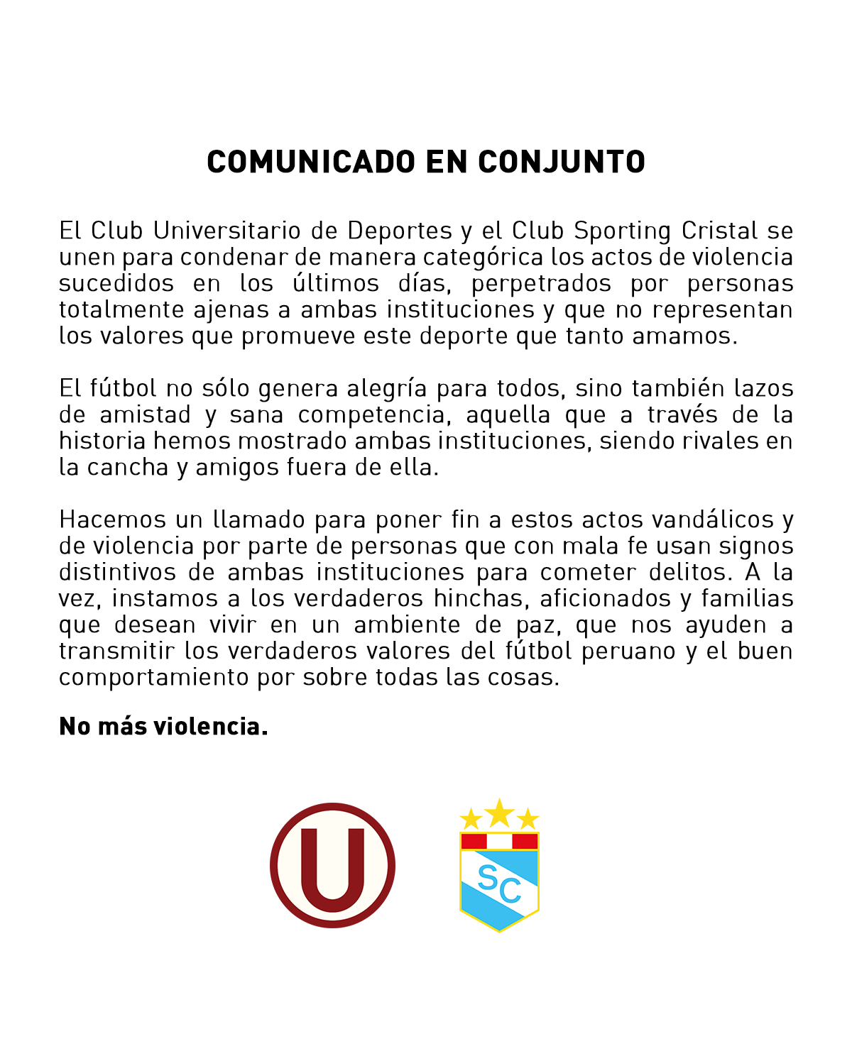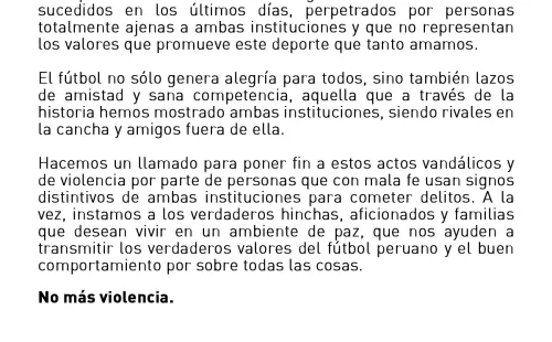 Tras ello, los propios clubes emitieron un comunicado llamando a la paz. Ojalá se hagan las investigaciones y las únicas consecuencias sean legales. No queremos más venganza ¡Queramos al fútbol peruano!