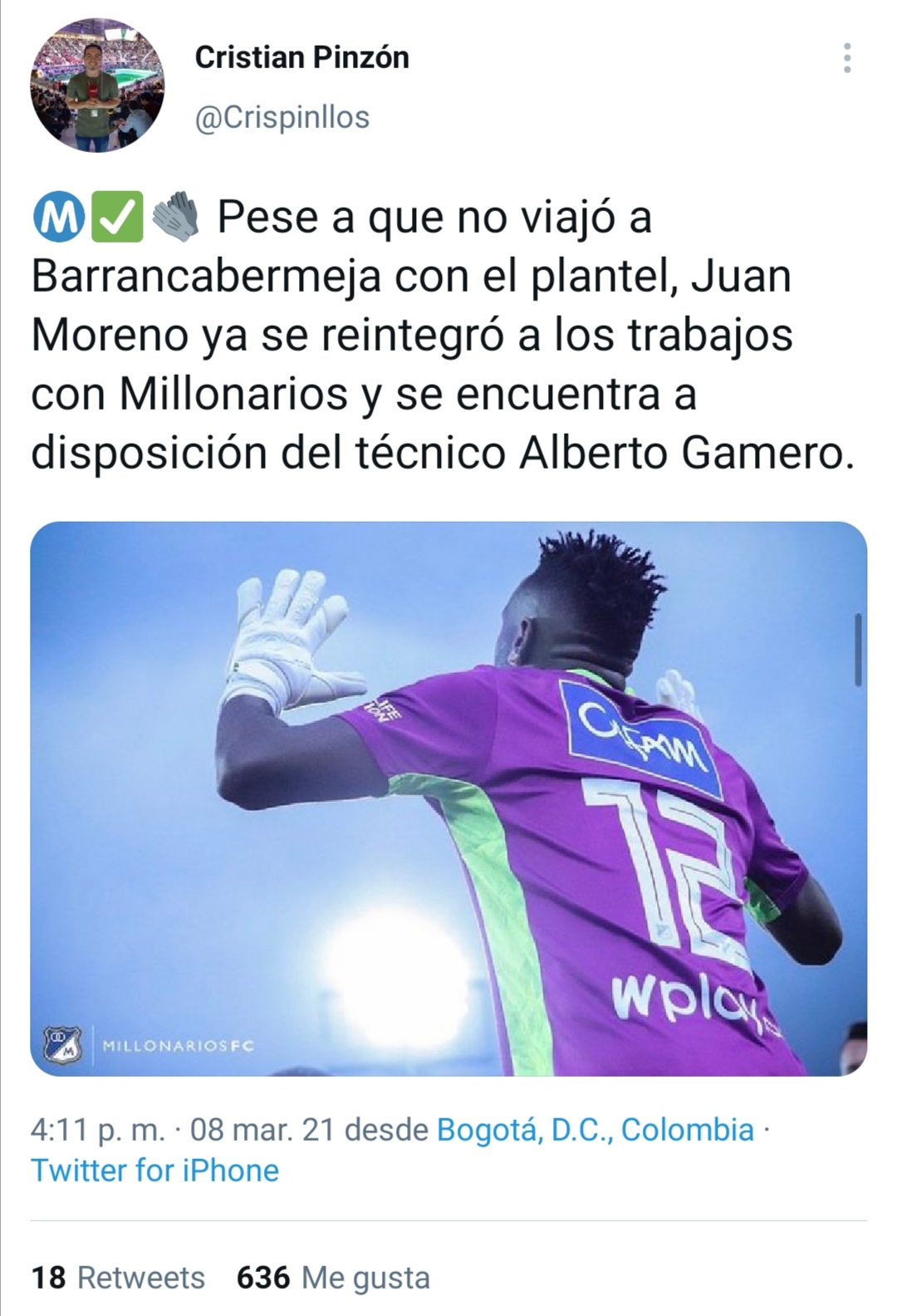 En las tres últimas fechas de la Liga BetPlay 2021-I, en donde Millonarios enfrentó a Jaguares de Córdoba en el Campin, después visitó a Boyacá Chicó y luego a Alianza Petrolera, la ausencia de Juan Moreno en el arco ‘Embajador’ fue notoria.