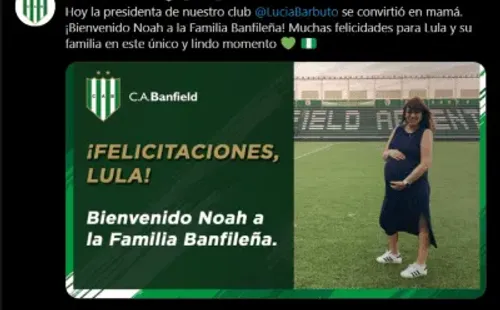 La hermosa noticia del Mundo Banfield de las últimas horas es la del nacimiento deNoah Lizenberg Barbuto, hijo Lucía Barbuto, presidenta del club. En sus redes sociales, el Taladro le dio la bienvenida a la criatura, asumiendo que será hincha del club de la madre.