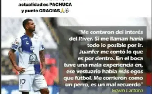 Molesto por el rumor que se generó respecto a un posible acercamiento con River, Edwin Cardona se expresó a través de una historia de Instagram.