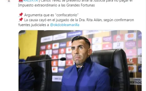 Sí, ¿para qué te contamos esto enBolavip? Por lo que informó este jueves a tardeDoble Amarillaa tráves de sus redes sociales. Según informó dicho medio,Carlos Tevezjustamente se presentó ante la Justicia con la intención de no pagar este impuesto extraordinario a las grandes fortunas.