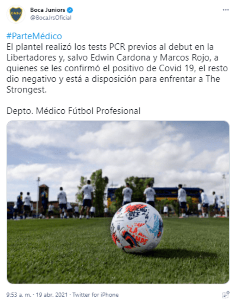 “El plantel realizó los tests PCR previos al debut en la Libertadores y, salvo Edwin Cardona y Marcos Rojo, a quienes se les confirmó el positivo de Covid 19, el resto dio negativo y está a disposición para enfrentar a The Strongest“, confirmó el Xeneize, mediante un comunicado oficial, por aquel entonces.