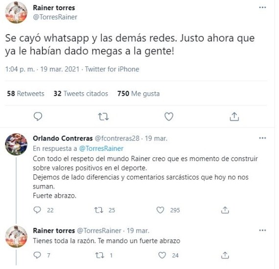 En uno de los post de Rainer donde volvió a generar polémica entre hinchas de Universitario y Alianza Lima, el exfutbolista Orlando Contreras respondió con un mensaje de reflexión: “Con todo el respeto del mundo Rainer creo que es momento de construir sobre valores positivos en el deporte. Dejemos de lado diferencias y comentarios sarcásticos que hoy no nos suman. Fuerte abrazo”.