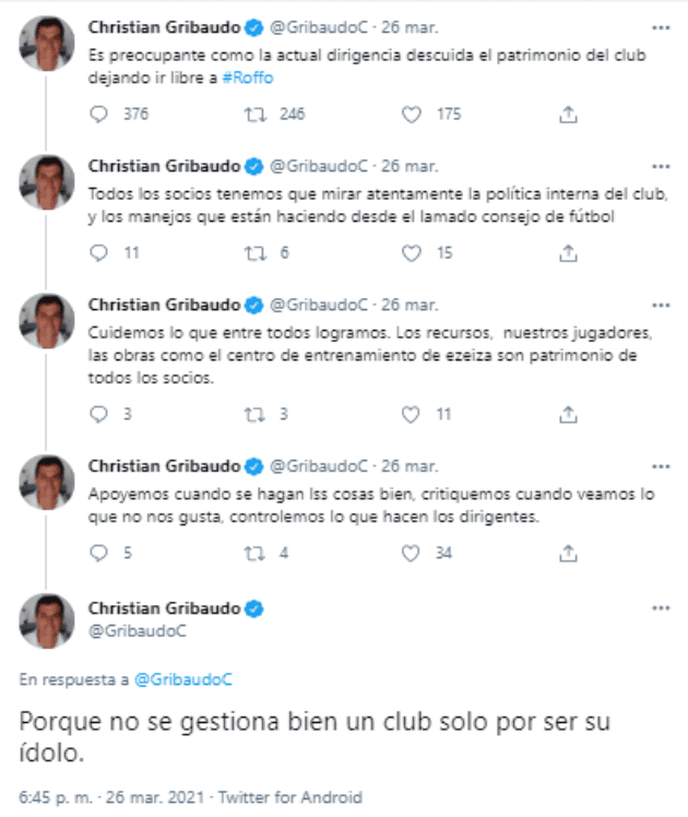 Así como muchos hinchas del conjunto de La Ribera se hicieron escuchar a través de las redes sociales,Christian Gribaudo, ex candidato a presidente del club, tampoco dejó pasar la oportunidad para exteriorizar su parecer. “Es preocupante como la actual dirigencia descuida el patrimonio del club dejando ir libre a Roffo“, abrió.